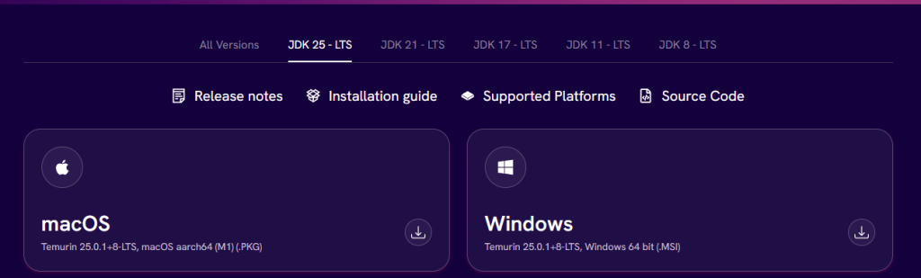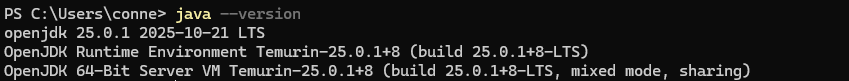 Once you’ve downloaded the .msi file from Adoptium, run the the installer to get the latest version of Java 25, you can verify it’s installed by opening your command prompt and typing in:
